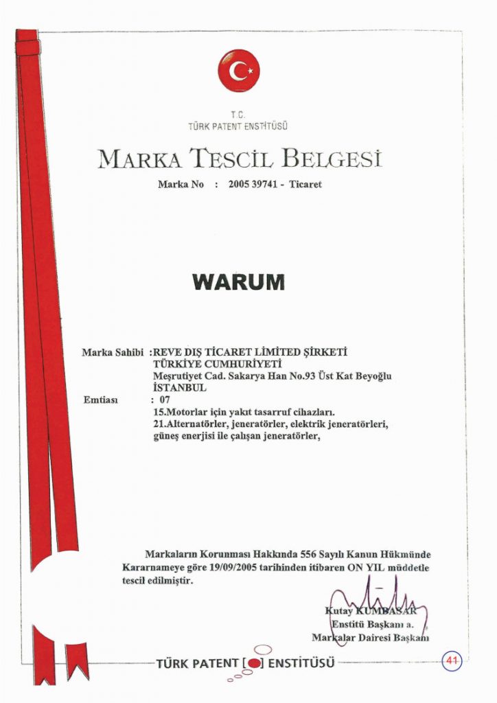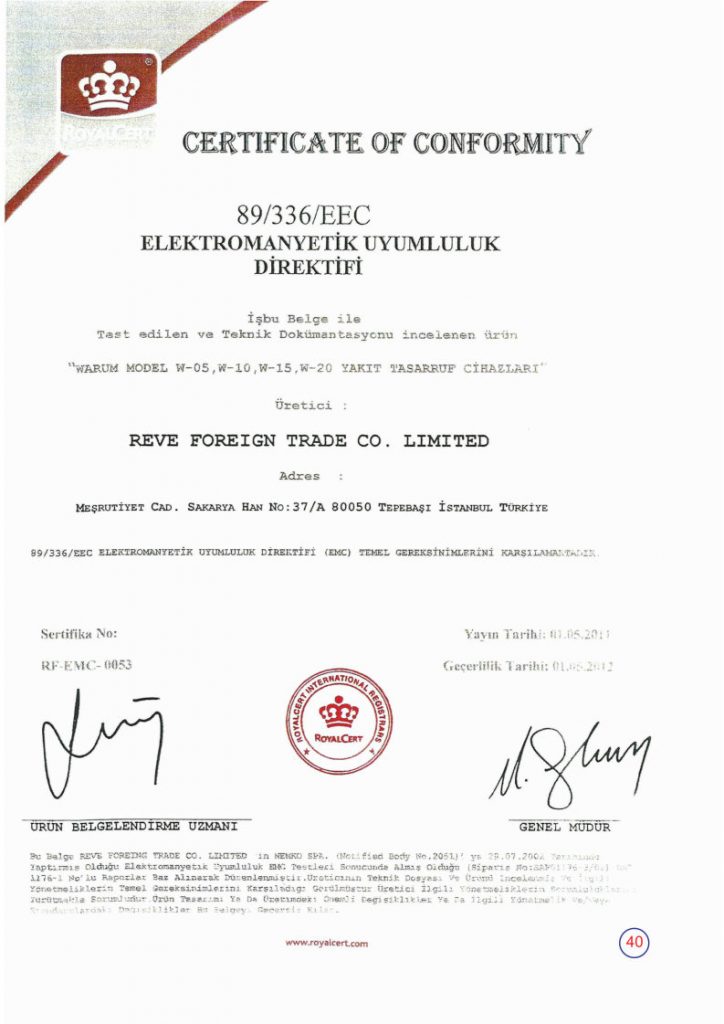 WARUM cihazları, gaz emisyonu, elektrikli cihazlar ve manyetik etkili cihazlar ile ilgili tüm Avrupa Birliği (CE) güvenlik standartlarına uygunluk belgelerine sahiptir.